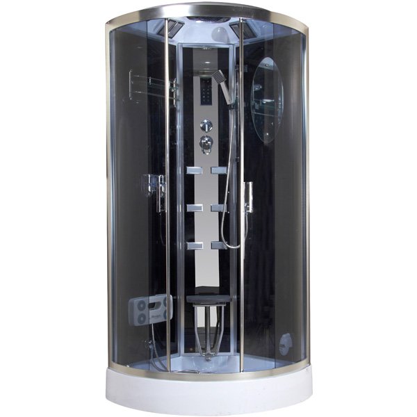 Акриловый поддон на каркасе низкий 15,5 см., глубина 5 см. Сифон с гофрой, крыша, гидромассаж 6 форсунок, гидромассаж ног, сенсорный пульт, светодиодная подсветка, радио, принудительная вентиляция, откидное сиденье, ручной душ на штанге, тропический душ, полка, зеркало, дозаторы жидкого мыла. Задние стенки - стекло черное; переднее стекло тонированное; профиль полированный. Экран несъемный.