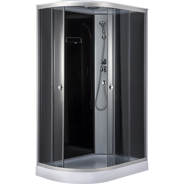 Акриловый поддон на каркасе низкий 15 см. Сифон с гофрой, крыша, тропический душ, ручной душ 3 режима + крепление, смеситель 2-х режимный. Задние стенки - стекло черное; переднее стекло тонированное; центральная панель - пластик; профиль матовый. Экран несъемный.